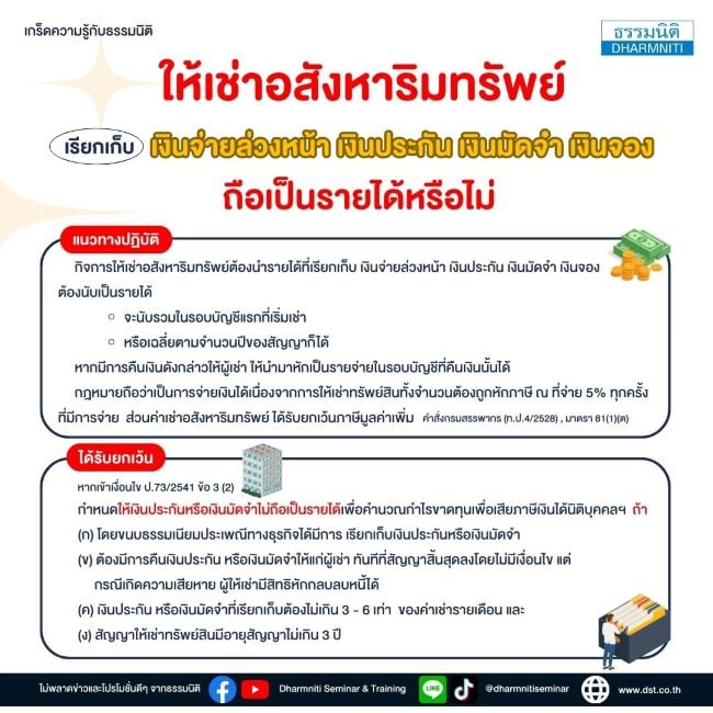 ให้เช่าอสังหาริมทรัพย์เรียกเก็บเงินจ่ายล่วงหน้า เงินประกัน เงินมัดจำ เงินจอง ถือเป็นรายได้หรือไม่