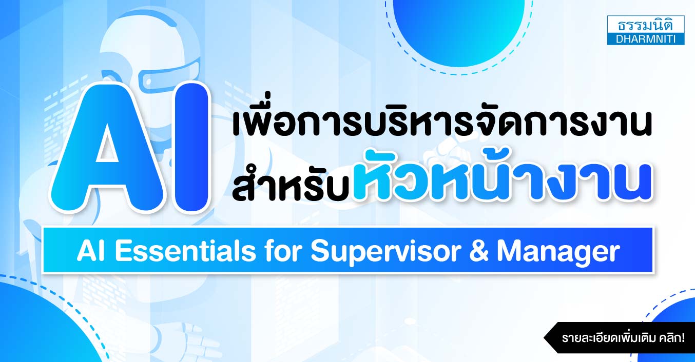 1. ประโยชน์ของการใช้งาน AI สำหรับหัวหน้างาน (Introduction to AI Management) 1.1 AI คืออะไร และทำไมผู้บริหารยุคใหม่ต้องใช้ 1.2 ประเภทของ AI ที่หัวหน้างานควรรู้ (Generative AI, Predictive AI, Automation) 1.3 การใช้ AI ช่วยตัดสินใจด้วยข้อมูล (Decision Intelligence)