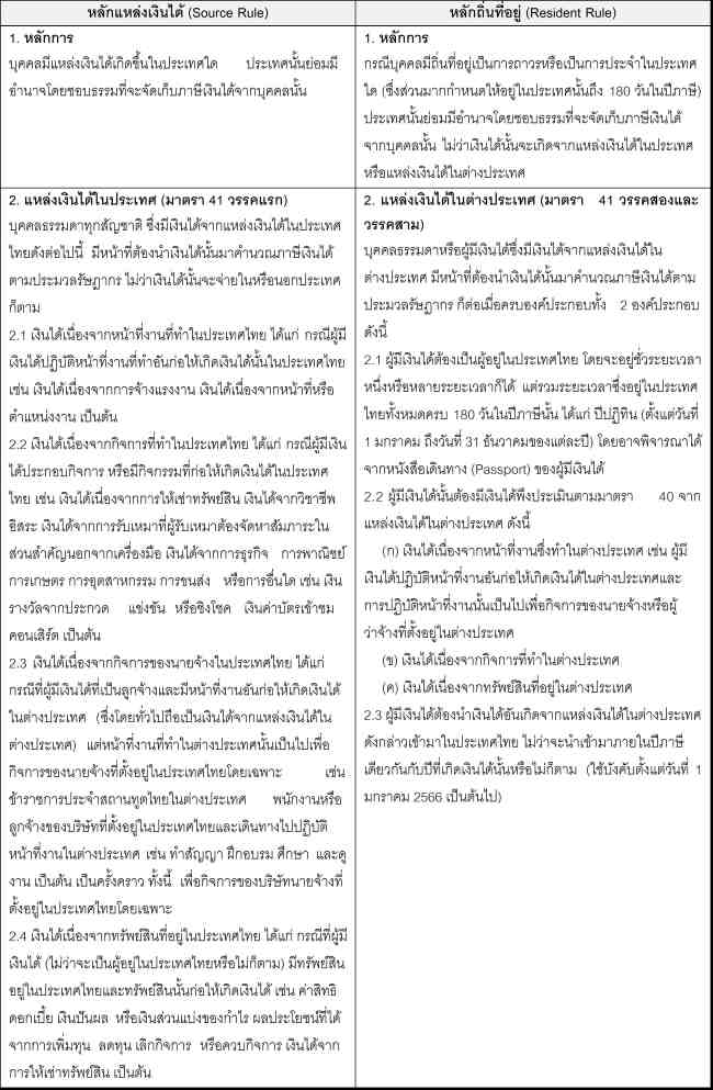 ประมวลรัษฎากรเป็นกฎหมายภาษีซึ่งกำหนดให้บุคคลธรรมดาที่มีเงินได้พึงประเมินตามที่กฎหมายกำหนด มีหน้าที่ต้องนำเงินได้ดังกล่าวมาคำนวณภาษีตามหลักเกณฑ์และเงื่อนไขที่กำหนด โดยมาตรา 41 แห่งประมวลรัษฎากร กำหนดว่า “ผู้มีเงินได้พึงประเมินตามมาตรา 40 ในปีภาษีที่ล่วงมาแล้ว เนื่องจากหน้าที่งานหรือกิจการที่ทำในประเทศไทย หรือเนื่องจากกิจการของนายจ้างในประเทศไทย หรือเนื่องจากทรัพย์สินที่อยู่ในประเทศไทย ต้องเสียภาษีตามบทบัญญัติในส่วนนี้ ไม่ว่าเงินได้นั้นจะจ่ายในหรือนอกประเทศ ผู้อยู่ในประเทศไทยมีเงินได้พึงประเมินตามมาตรา 40 ในปีภาษีที่ล่วงมาแล้ว เนื่องจากหน้าที่งานหรือกิจการที่ทำในต่างประเทศ หรือเนื่องจากทรัพย์สินที่อยู่ในต่างประเทศ ต้องเสียภาษีเงินได้ตามบทบัญญัติในส่วนนี้ เมื่อนำเงินได้พึงประเมินนั้นเข้ามาในประเทศไทย ผู้ใดอยู่ในประเทศไทยชั่วระยะเวลาหนึ่งหรือหลายระยะ รวมเวลาทั้งหมดถึง 180 วัน ในปีภาษีปีใด ให้ถือว่าผู้นั้นเป็นผู้อยู่ในประเทศไทย” บทบัญญัติดังกล่าวได้กำหนดหลักในการจัดเก็บภาษีเงินได้บุคคลธรรมดา 2 หลัก ได้แก่ 1. หลักการได้มาซึ่งเงินได้จากแหล่งในประเทศ หรือเรียกว่า “หลักแหล่งเงินได้” (Source Rule) 2. หลักการได้มาซึ่งเงินได้เกิดจากแหล่งนอกประเทศ หรือเรียกว่า “หลักถิ่นที่อยู่” (Resident Rule) ทั้ง 2 หลักนี้มีความแตกต่างกันตามตารางดังนี้