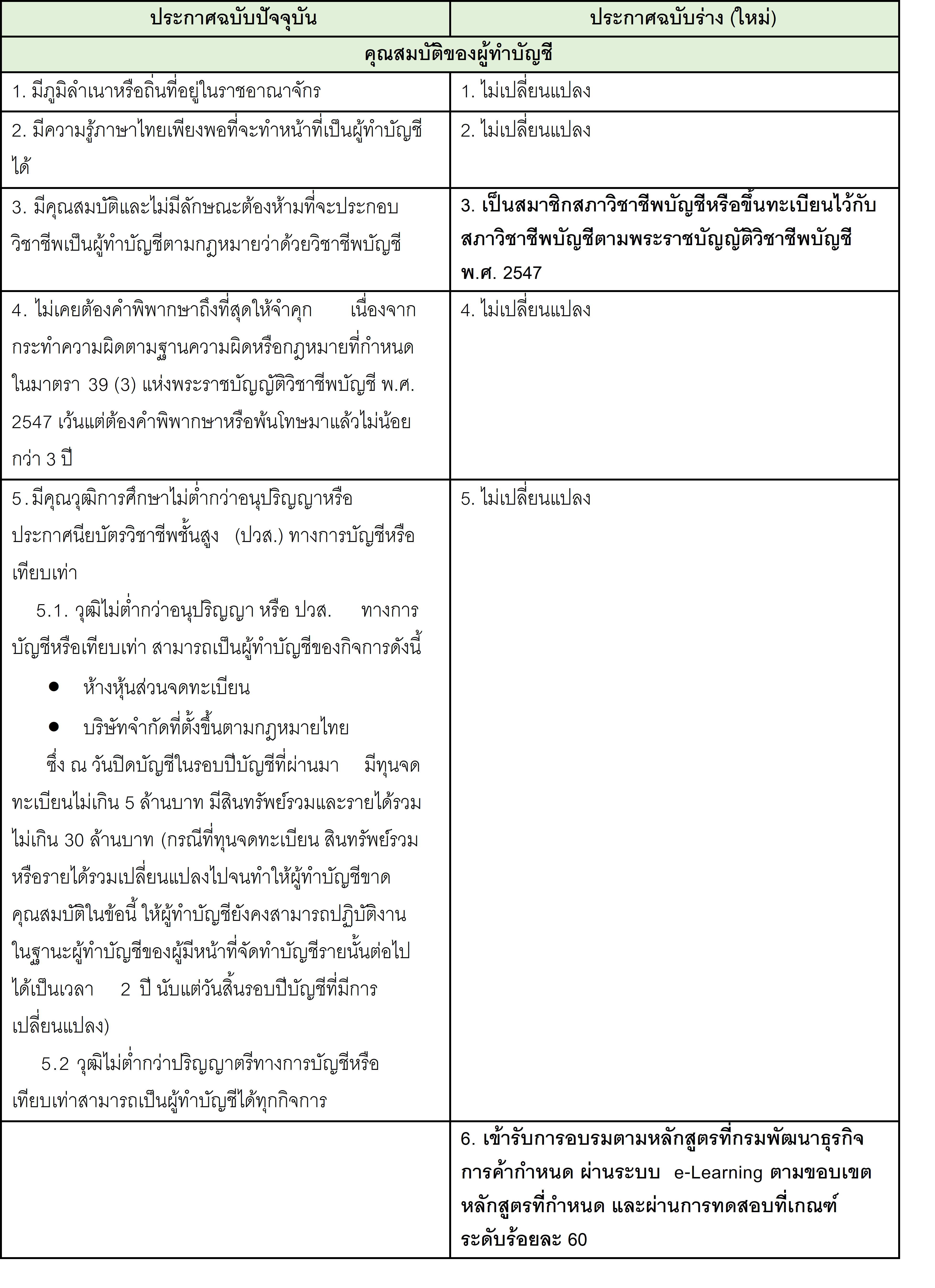 คุณสมบัติและเงื่อนไขของการเป็นผู้ทำบัญชีนั้นได้กำหนดไว้ในพระราชบัญญัติการบัญชี พ.ศ. 2543 และกระทรวงพาณิชย์มีการปรับปรุงคุณสมบัติและเงื่อนไขอย่างต่อเนื่องมาแล้วจำนวน 7 ฉบับ เนื่องจากเหตุการณ์ปัจจุบัน กฎหมายและหลักการที่เกี่ยวข้องกับผู้ทำบัญชีมีหลายประการที่เปลี่ยนแปลงไป ทำให้บทบัญญัติต่าง ๆ ที่ประกาศไว้ไม่สอดคล้องกับความก้าวหน้าในการจัดทำบัญชี กรมพัฒนาธุรกิจการค้าจึงได้ปรับปรุงแก้ไขประกาศที่เกี่ยวข้องกับคุณสมบัติและเงื่อนไขของการเป็นผู้ทำบัญชีให้ทันสมัยอย่างเหมาะสม สอดคล้องกับสถานการณ์ในปัจจุบัน และสอดคล้องกับพระราชบัญญัติวิชาชีพบัญชี พ.ศ. 2547 เพื่อให้เกิดความเชื่อมั่นต่อผู้ประกอบการ (ผู้มีหน้าที่จัดทำบัญชี) และบุคคลทั่วไปว่า “ผู้ทำบัญชีที่ได้รับการขึ้นทะเบียนนั้นเข้าใจข้อกฎหมายที่เกี่ยวข้องกับการจัดทำบัญชี และมีความรู้ความเข้าใจในงานรับผิดชอบของตนเมื่อได้รับการขึ้นทะเบียนเป็นผู้ทำบัญชีตามพระราชบัญญัติการบัญชี พ.ศ. 2543” การเปลี่ยนแปลงในคุณสมบัติมีการเพิ่มเงื่อนไขของการขึ้นทะเบียนเกี่ยวกับเรื่องการทดสอบความรู้ก่อนการขึ้นทะเบียนเพิ่มเติม ดังนั้นภายหลังการแก้ไขกฎหมายนี้และประกาศใช้แล้วจะสรุปได้ว่าผู้ที่ต้องการขึ้นทะเบียนเป็นผู้ทำบัญชีได้นั้นต้องมีคุณสมบัติครบตามเงื่อนไข ดังตารางเปรียบเทียบต่อไปนี้