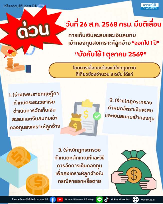 ด่วน! ครม. มีมติเลื่อนการเก็บเงินสะสมและเงินสมทบเข้ากองทุนสงเคราะห์ลูกจ้าง “ออกไป 1 ปี " (บังคับใช้ 1 ตุลาคม 2569)